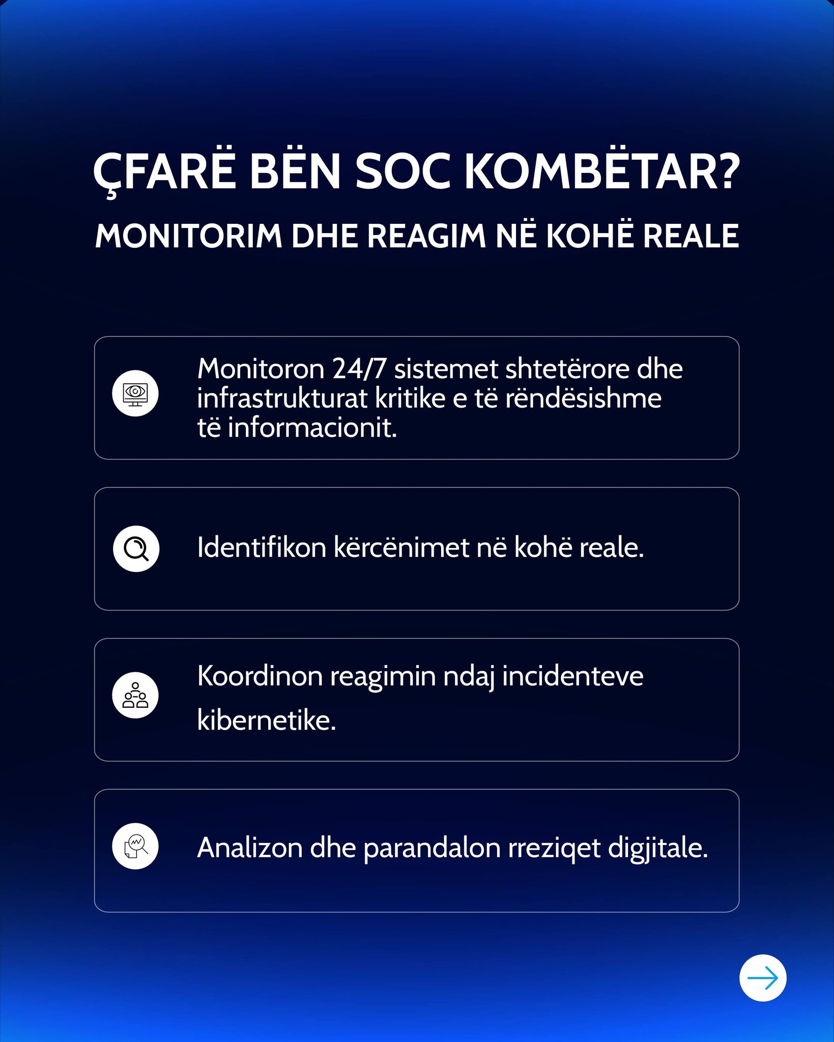 Funksionalizimi i plotë i SOC dhe CSIRT Kombëtar dhe forcimi i kapaciteteve të tyre përmes implementimit të platformave dhe mjeteve teknike të avancuara si dhe plotësimit me staf profesional, rrit ndjeshëm aftësinë për monitorim, parandalim dhe reagim ndaj incidenteve kibernetike, duke garantuar vazhdimësinë e shërbimeve kritike publike dhe private, dhe mbrojtjen e interesit qytetar. Për të mundësuar funksionimin e plotë të CSIRT Kombëtar, janë miratuar 20 akte nënligjore duke përmbyllur kornizën ligjore për implementimin e ligjit nr. 25/2024 “Për sigurinë kibernetike” i përafruar në nivel të lartë me Direktivën NIS2.