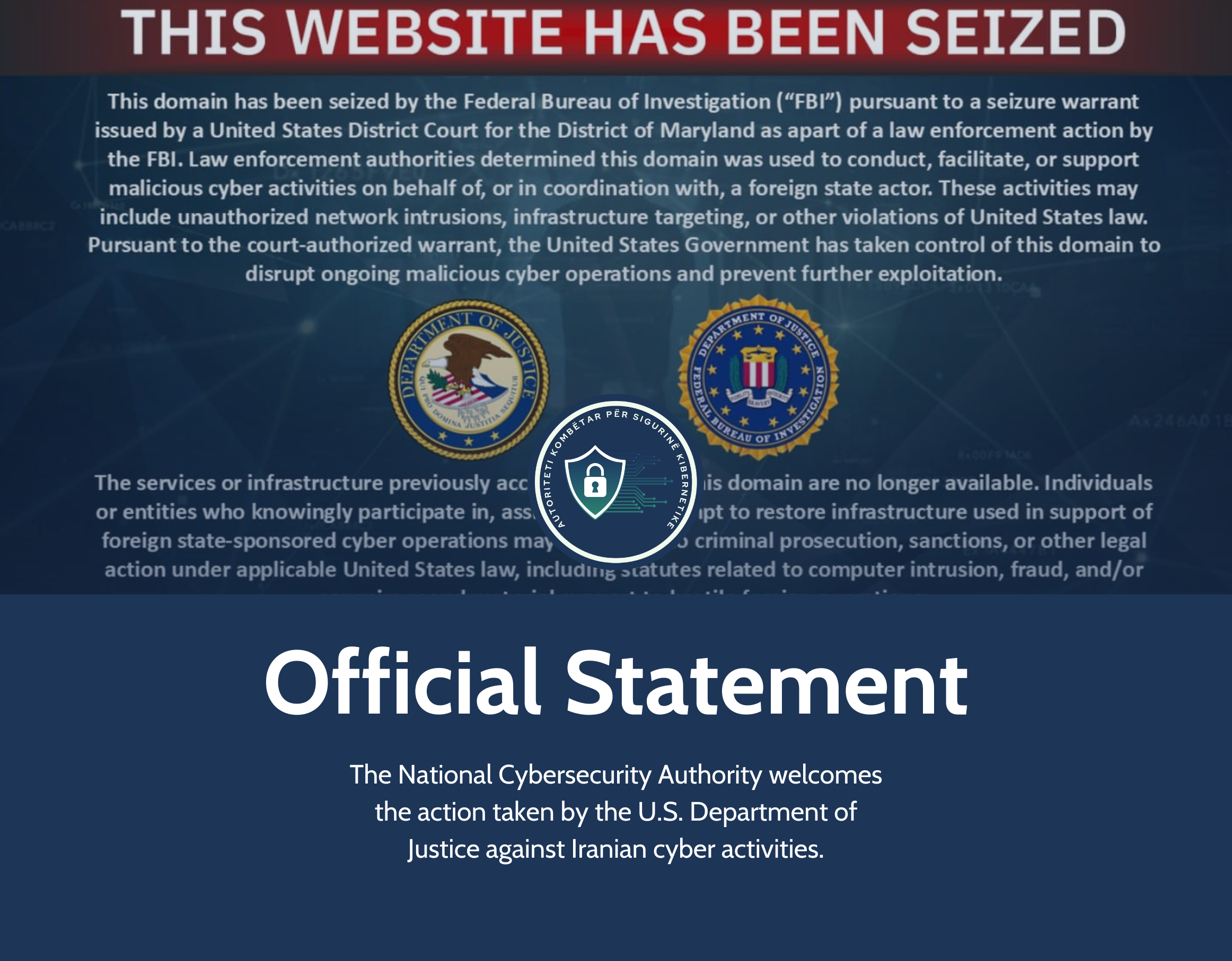The National Cyber Security Authority highly values the decision of the United States Department of Justice to seize domains used by Iranian state-sponsored actors to conduct cyberattacks and distribute sensitive data related to critical and important information infrastructures.