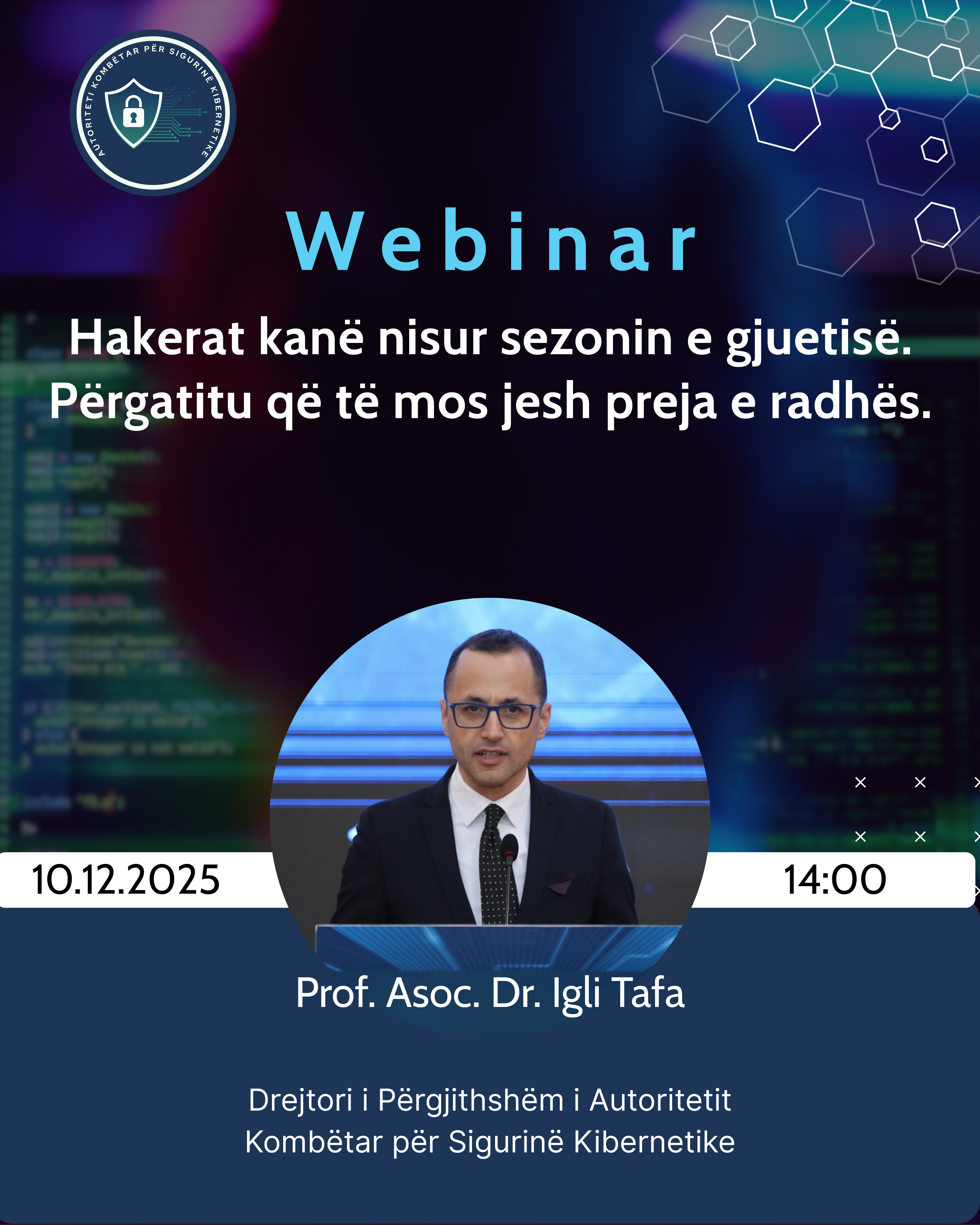 10.12.2025 @ 12:00 am – Autoriteti Kombëtar për Sigurinë Kibernetike organizon webinar-in përmbyllës të vitit 2025, të udhëhequr nga Drejtori i Përgjithshëm, z. Igli Tafa, me fokus rritjen e sigurisë digjitale gjatë periudhës së festave, një sezon kur hakerat janë më aktivë dhe sulmet kibernetike shtohen ndjeshëm.