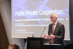 Znj. Emily van Rheenen, Udhëheqëse e Komponentit në CILC për projektin Cyber Balkans, vlerësoi përparimin e Shqipërisë drejt përafrimit me eIDAS 2.0, ndërsa Geert-Jan van de Ven, Drejtor i Qendrës së Sigurisë dhe Privatësisë së Informacionit në Holandë, nënvizoi rëndësinë e bashkëpunimit publik–privat për funksionimin e një ekosistemi të besueshëm të identitetit elektronik. Në vijim, përfaqësuesit e AKSHI-t prezantuan qasjen praktike të zbatimit të Portofolit Digjital në Shqipëri, duke paraqitur elementet kryesore të arkitekturës së tij dhe mundësitë që kjo reformë sjell në ofrimin e shërbimeve publike.